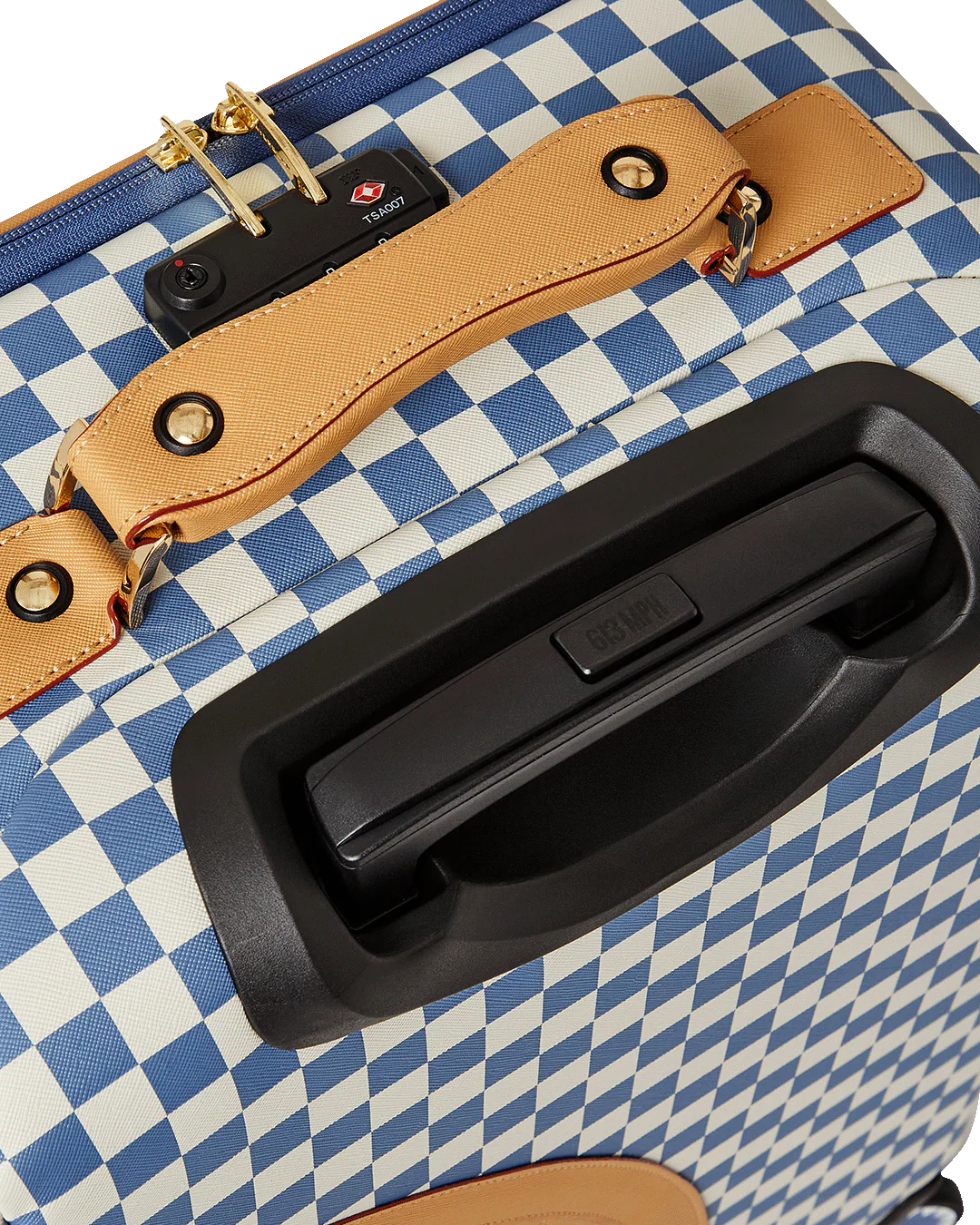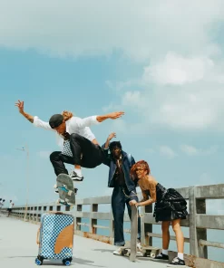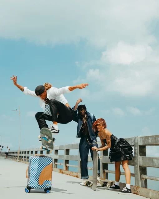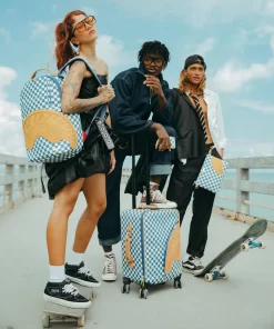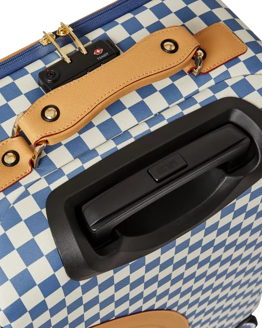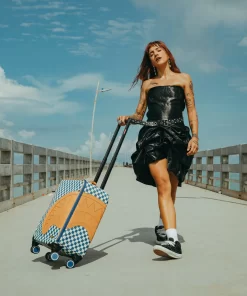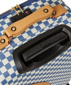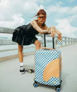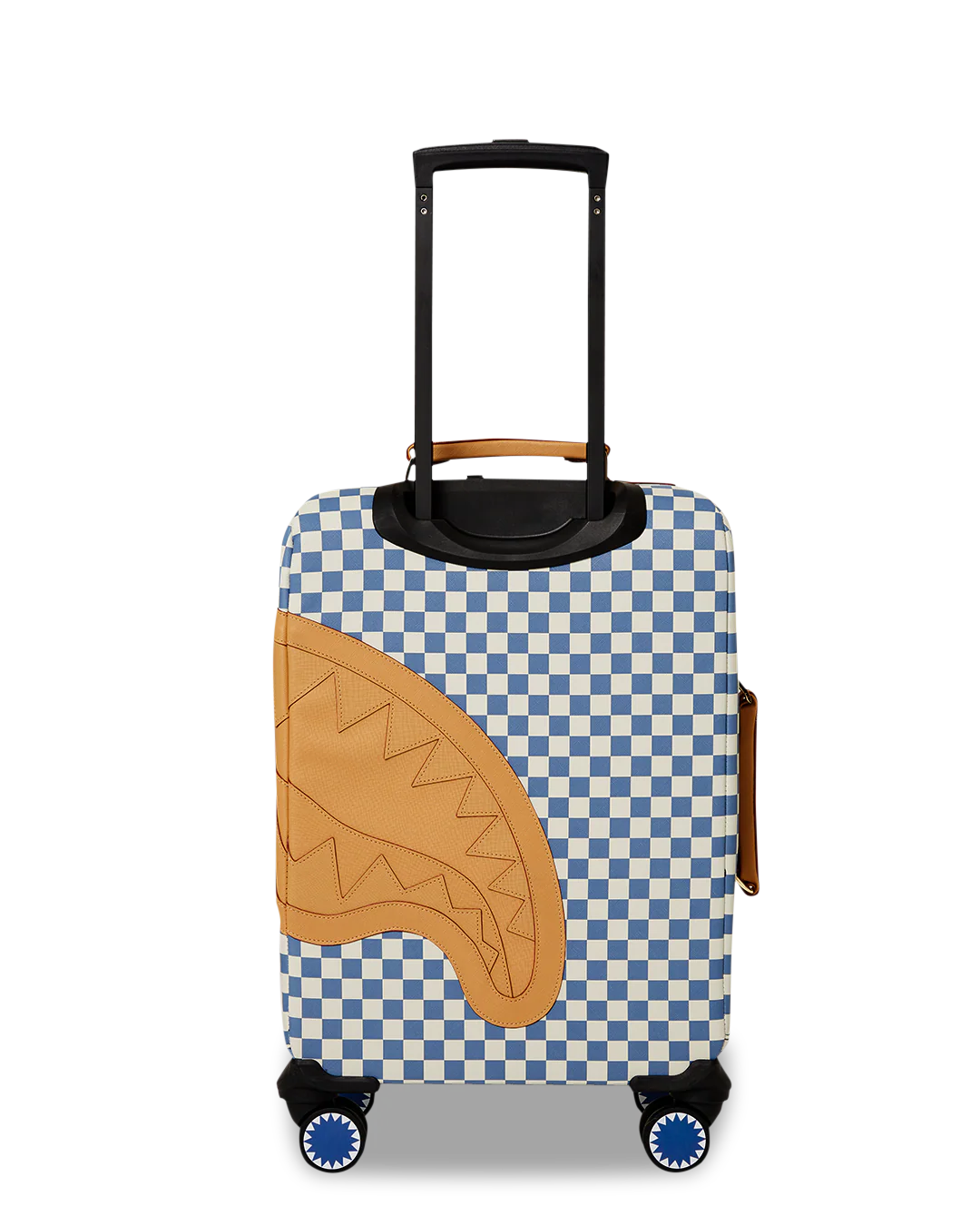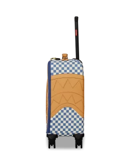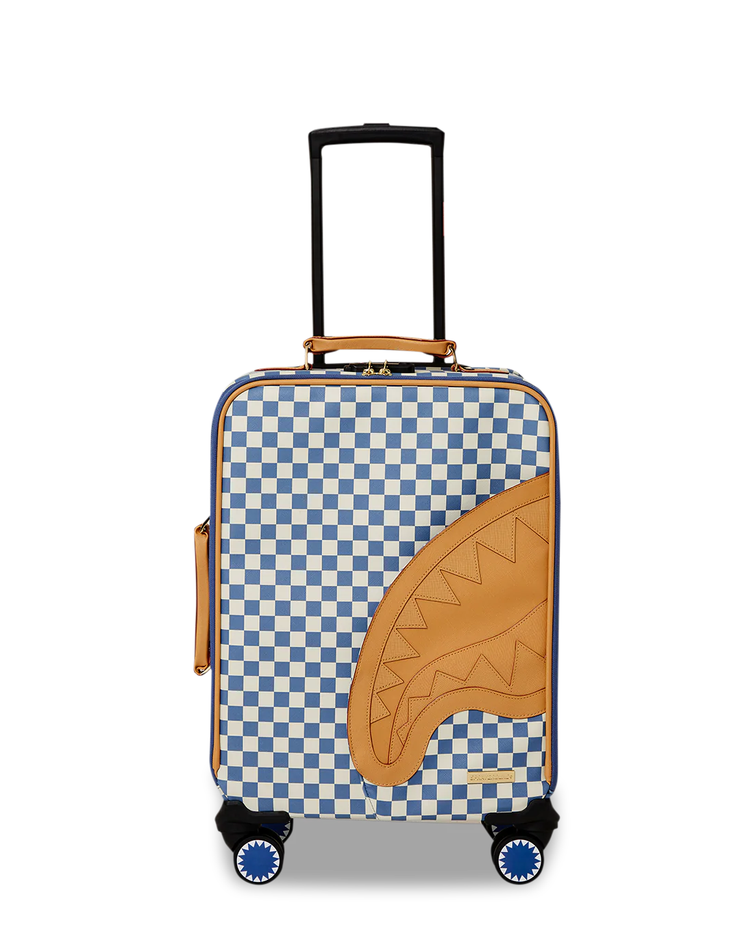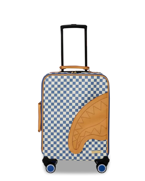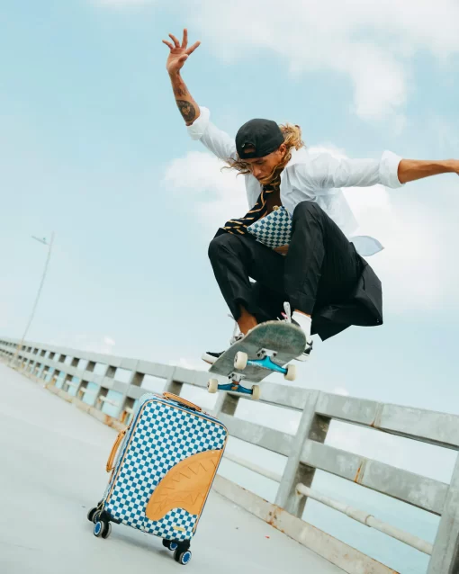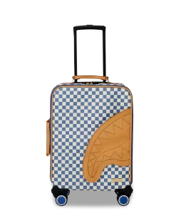 100 % Polyvinyl Chloride Shell – AKA 100% Faux Leather H: 19.5” x W: 14.5“x D: 7” YKK® Zipper FrameFront Exterior PocketEmbossed LogoFaux leather top & side handles 4 Dual Spinning Recessed WheelsTelescope Adjustable Handle – 2 positions INTERIOR:Multiple Pockets and Compartments for Maximum Organization3 Zippered Pocket4 Mesh PocketsShark Print Satin LiningMesh organizer pockets Fastening StrapsNylon Zippers with Metal Hardware