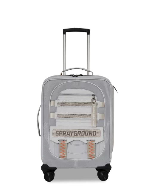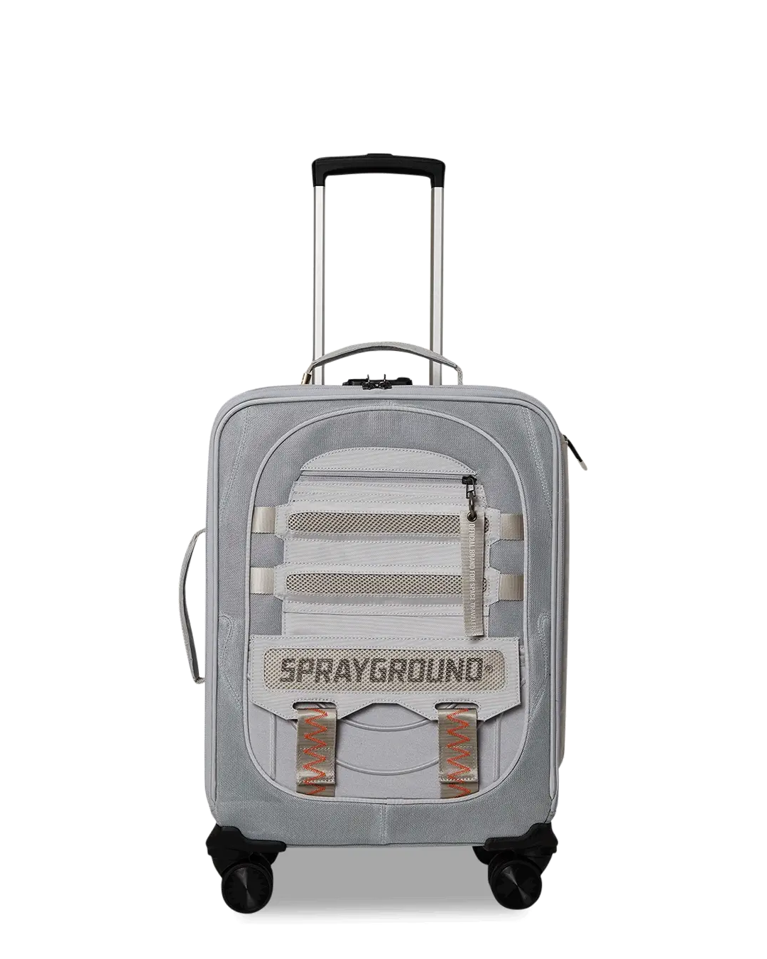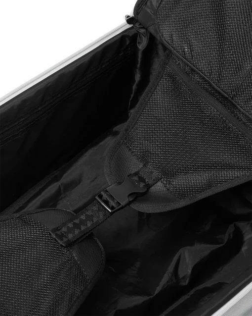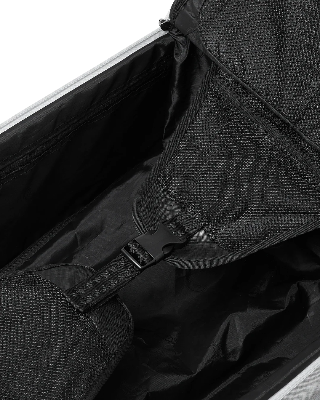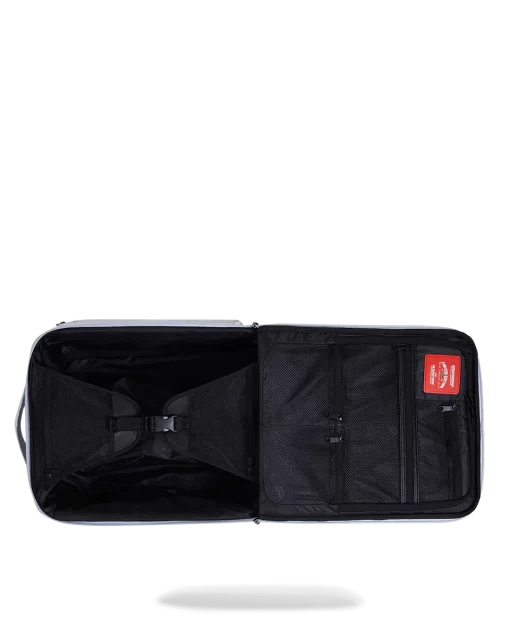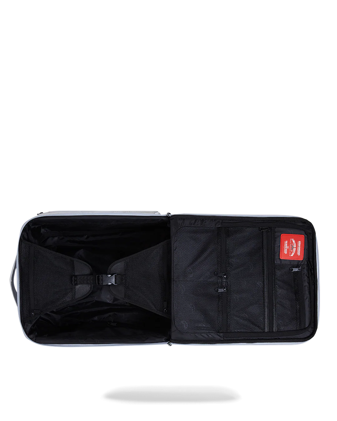 EXTERIOR:100 % Polyvinyl Chloride Shell – AKA 100% Faux Leather H: 19.5” x W: 14.5“x D: 7” YKK® Zipper FrameFront Exterior PocketEmbossed LogoFaux leather top & side handles 4 Dual Spinning Recessed WheelsTelescope Adjustable Handle – 2 positions INTERIOR:Multiple Pockets and Compartments for Maximum Organization3 Zippered Pocket4 Mesh PocketsShark Print Satin LiningMesh organizer pockets Fastening StrapsNylon Zippers with Metal Hardware