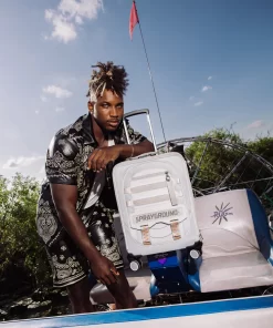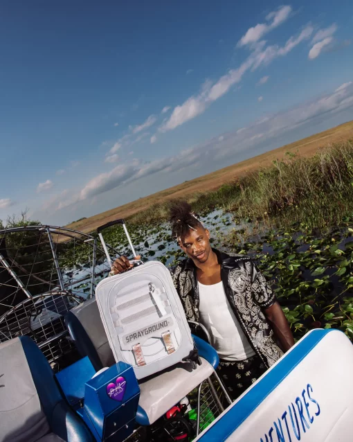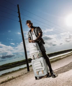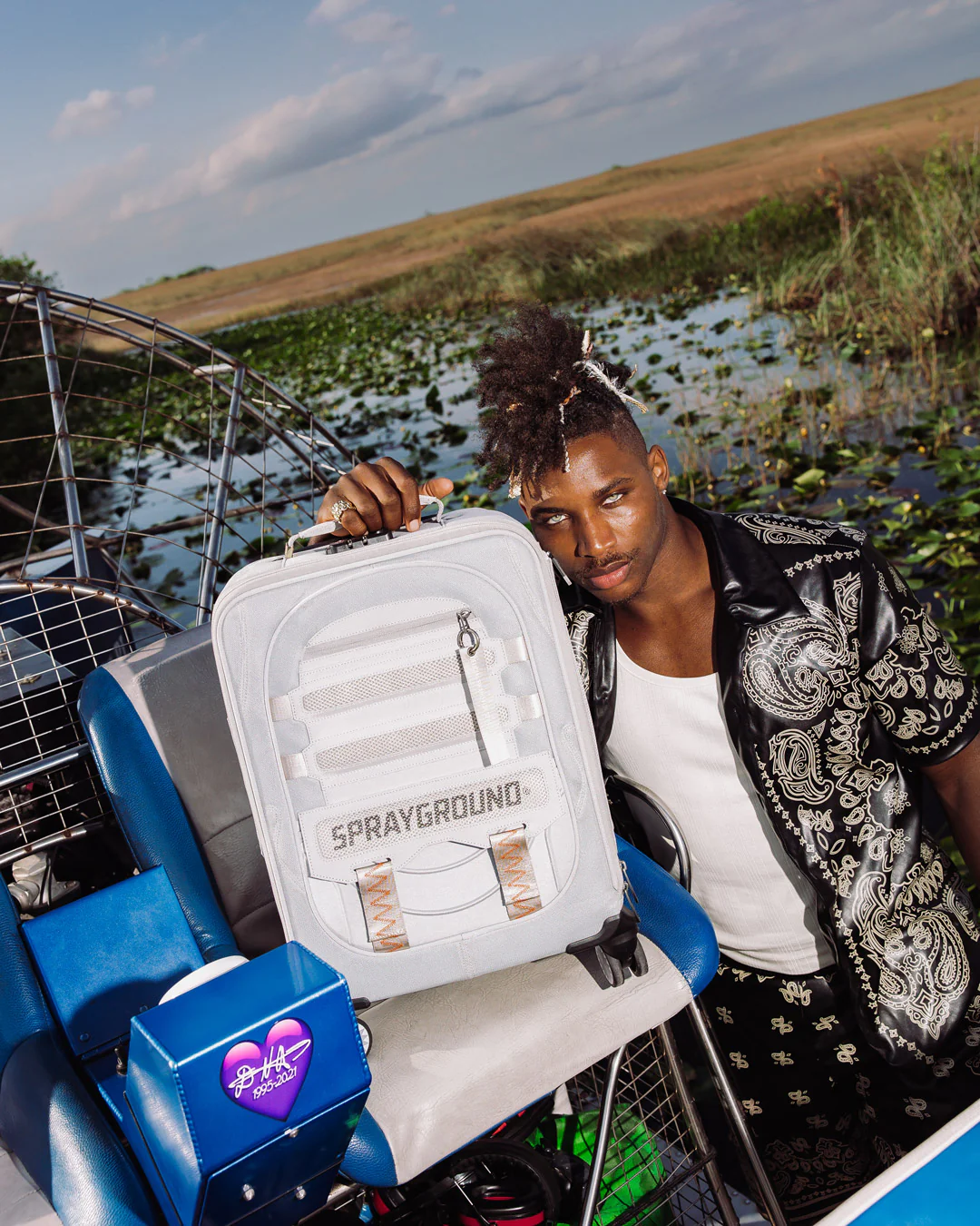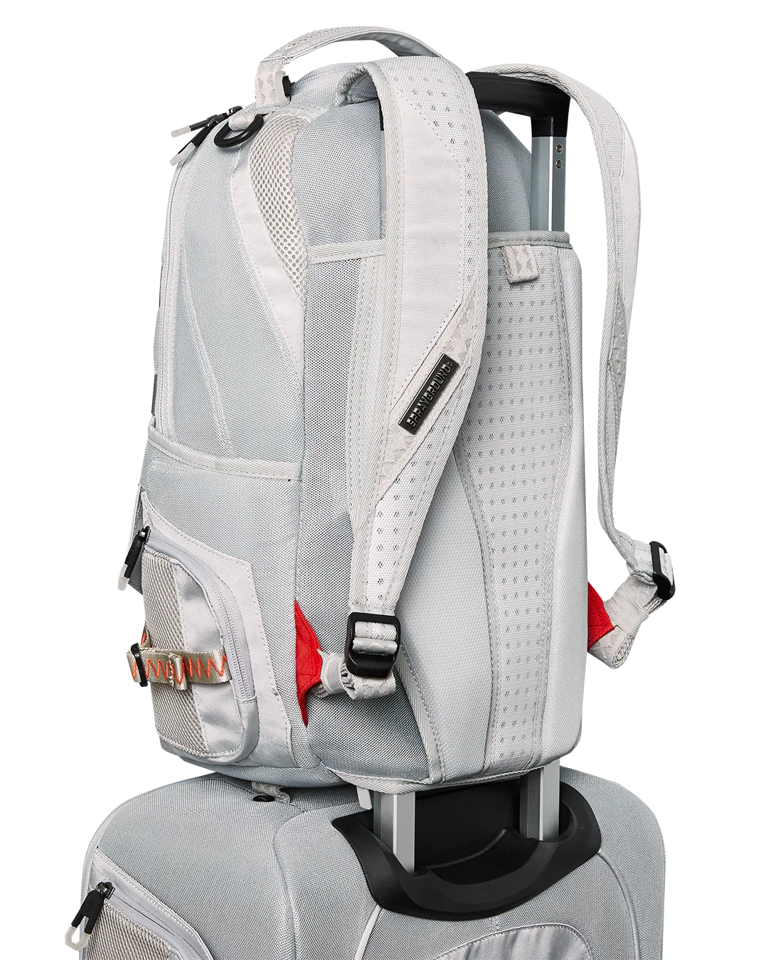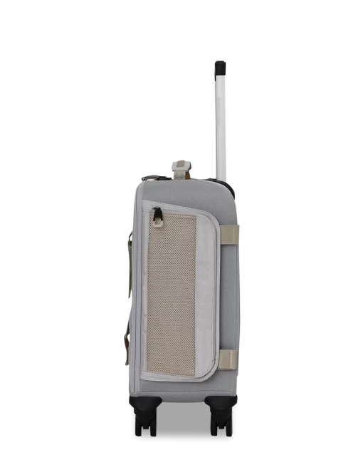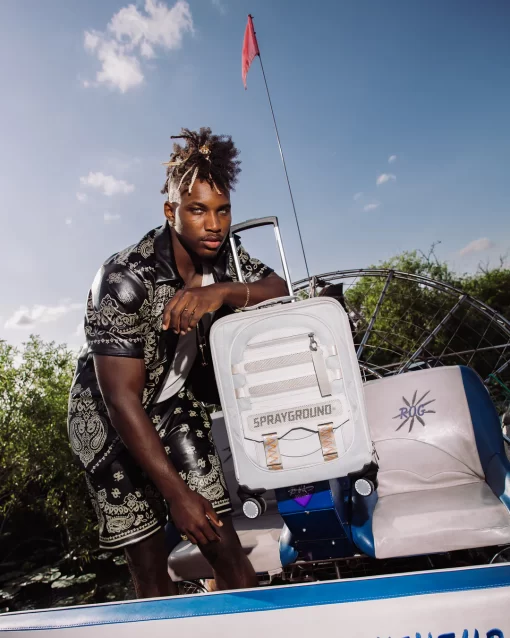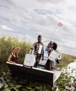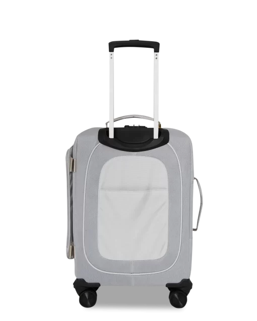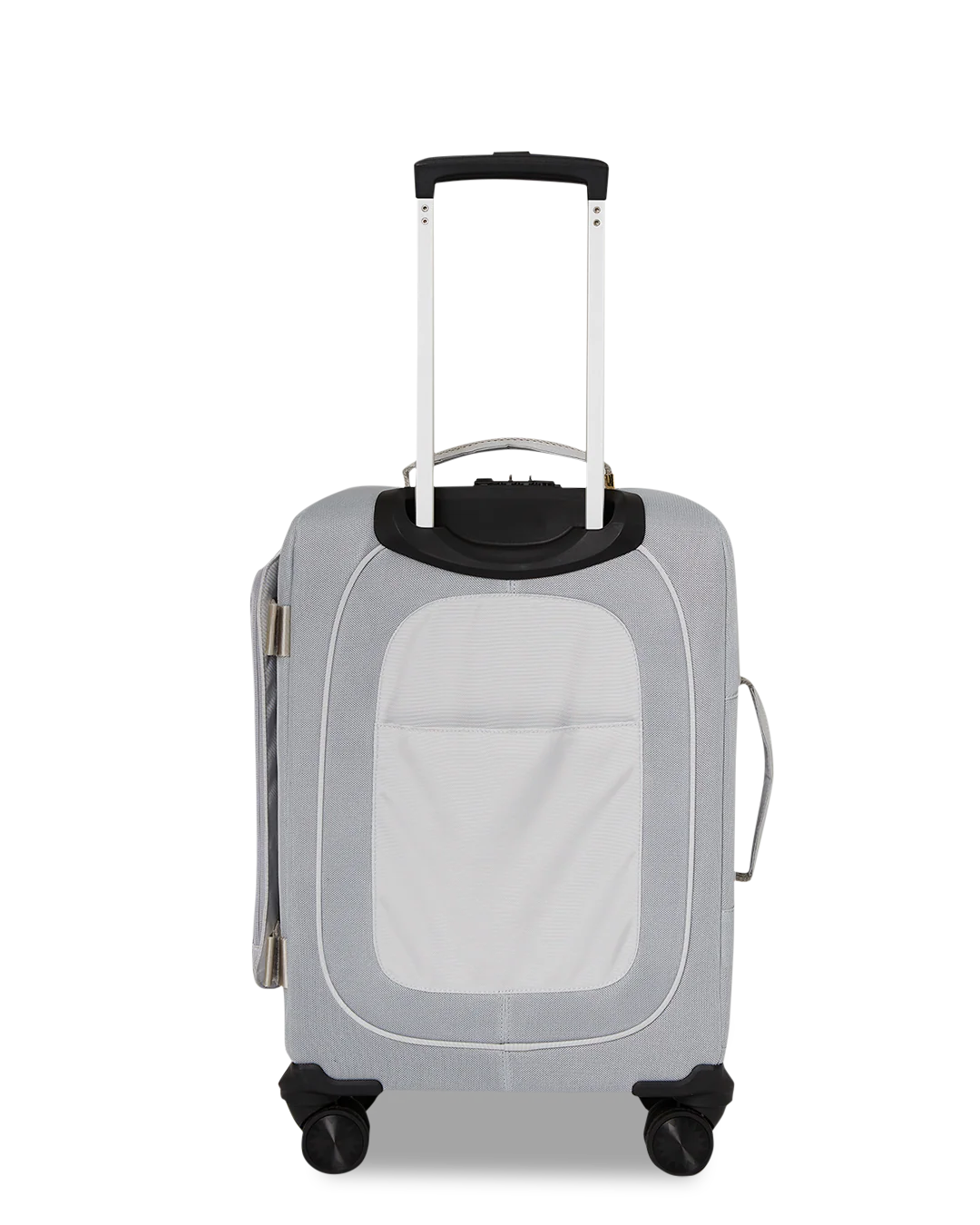 EXTERIOR:100 % Polyvinyl Chloride Shell – AKA 100% Faux Leather H: 19.5” x W: 14.5“x D: 7” YKK® Zipper FrameFront Exterior PocketEmbossed LogoFaux leather top & side handles 4 Dual Spinning Recessed WheelsTelescope Adjustable Handle – 2 positions INTERIOR:Multiple Pockets and Compartments for Maximum Organization3 Zippered Pocket4 Mesh PocketsShark Print Satin LiningMesh organizer pockets Fastening StrapsNylon Zippers with Metal Hardware