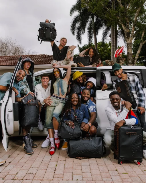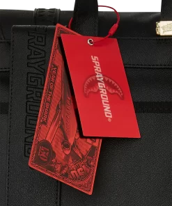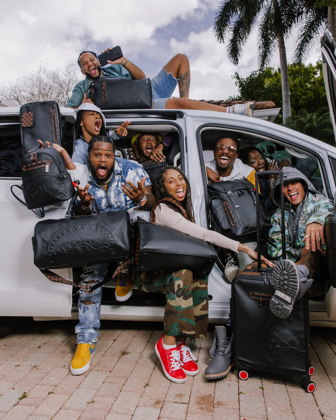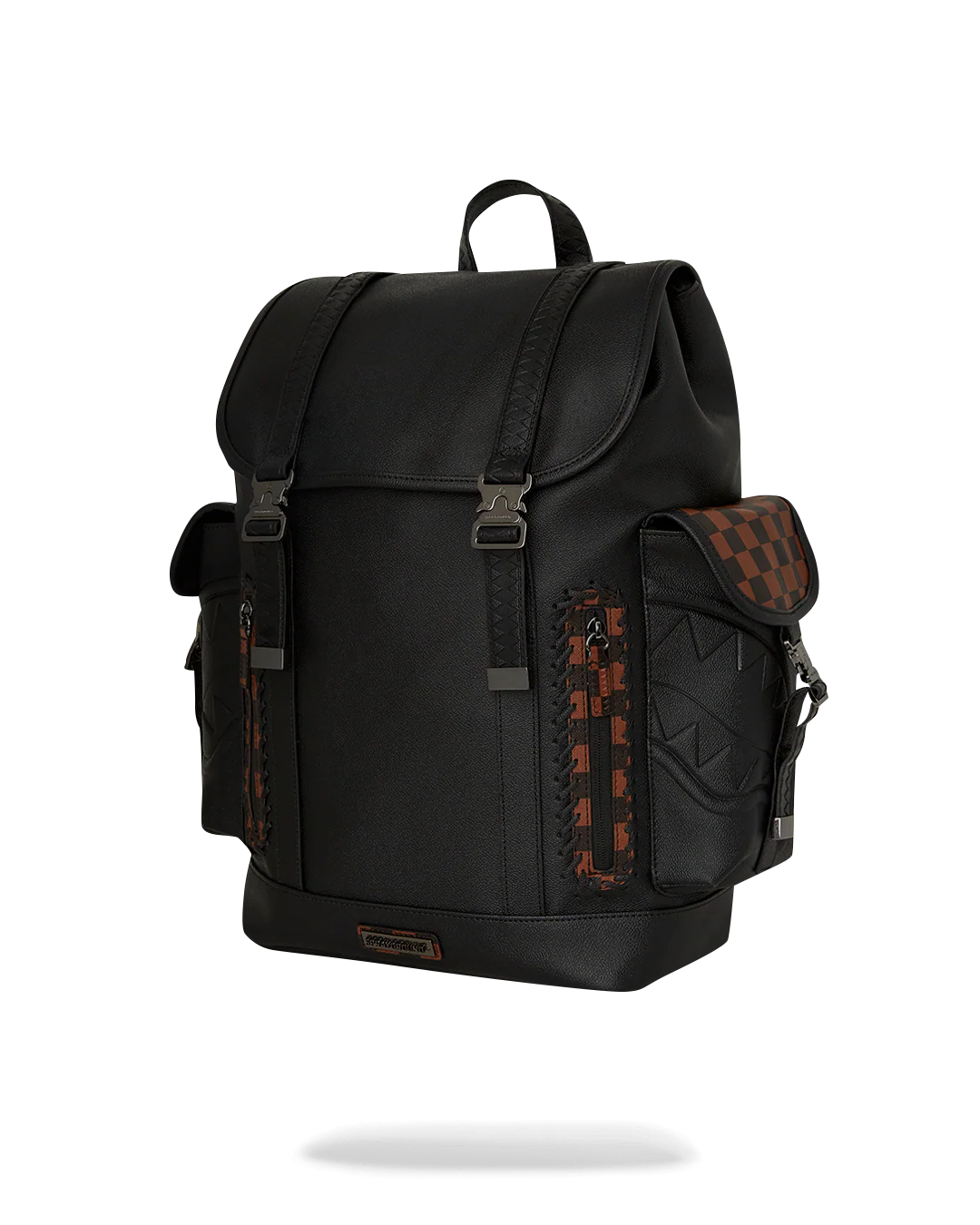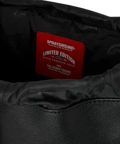 PVC bag with embossed details such as the sharkmouth and zipper pullers. Sewn faux leather details around the front zipper pocket.