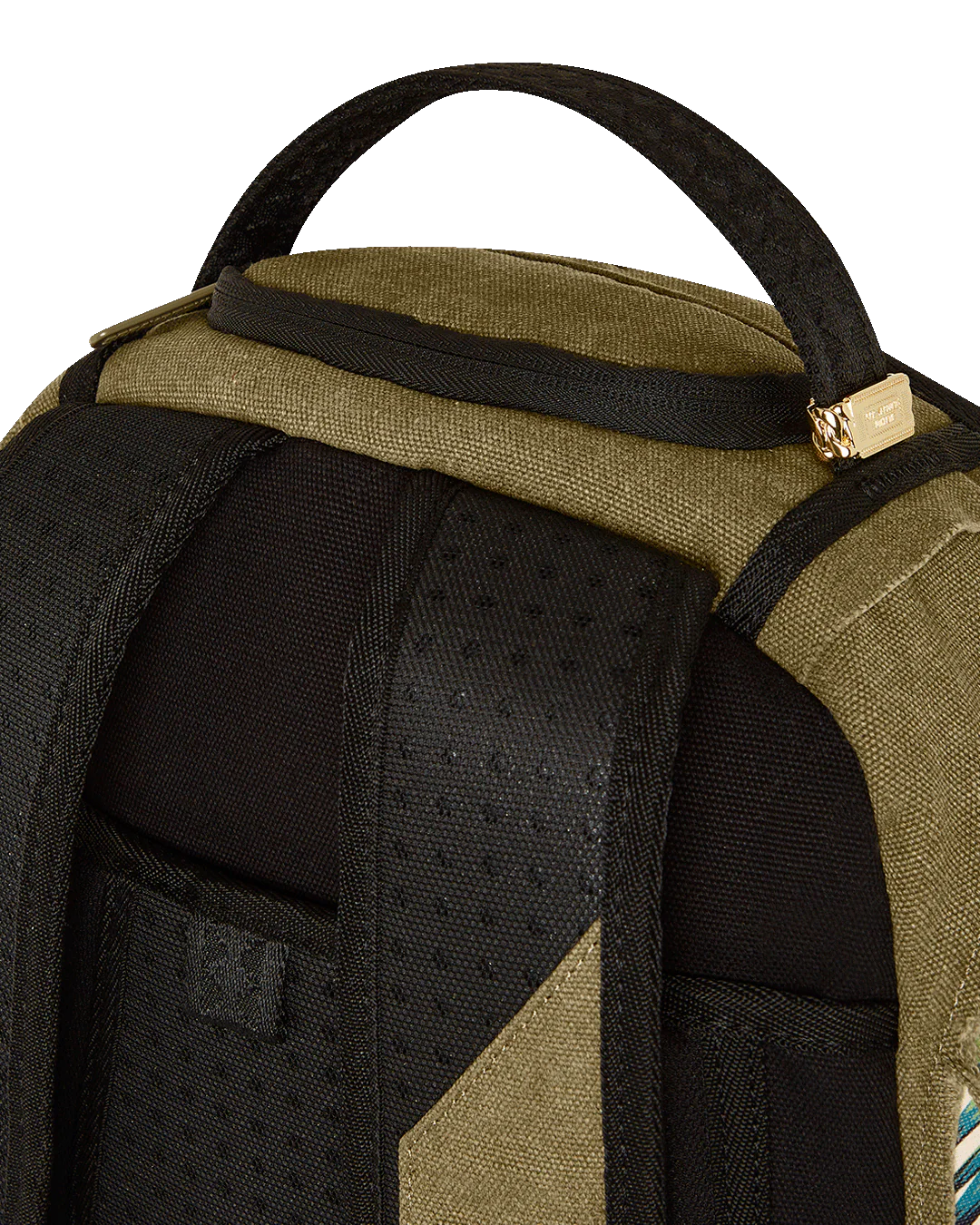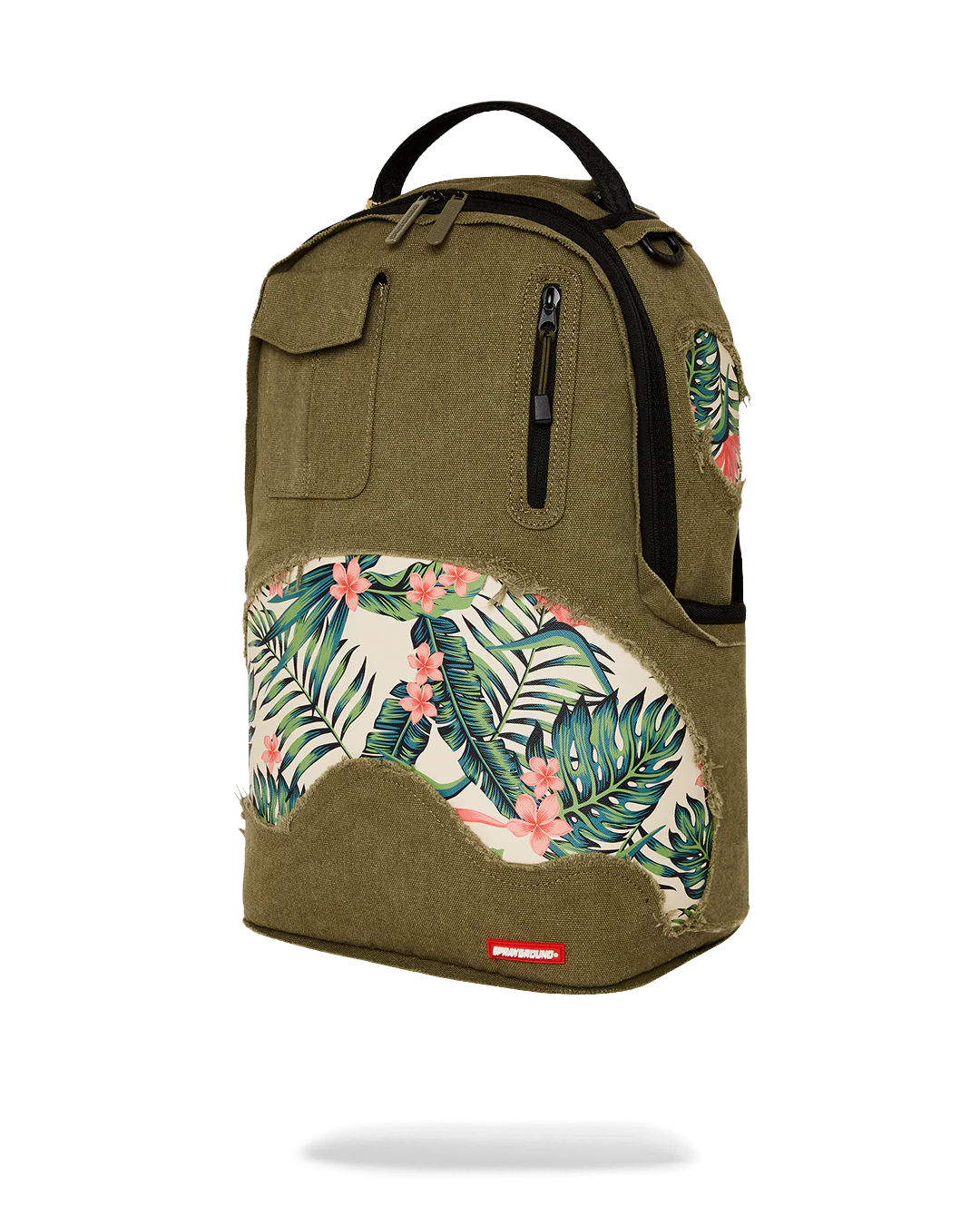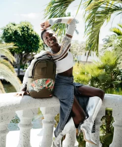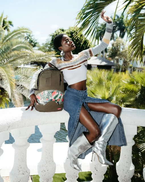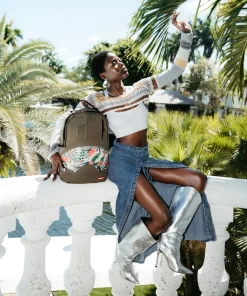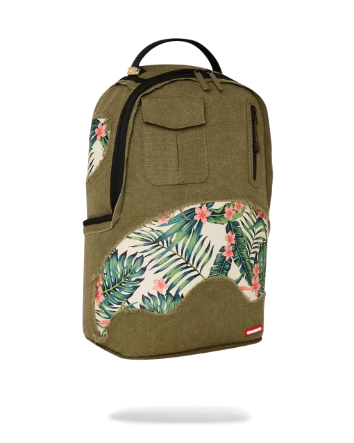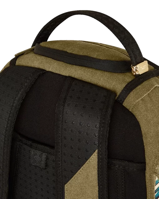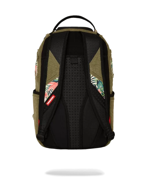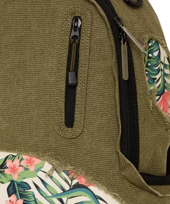 100% Cotton green army canvas over custom printed PVC leather mouth with fringe details Features an exterior cargo pocket & a vertical zipper pocket